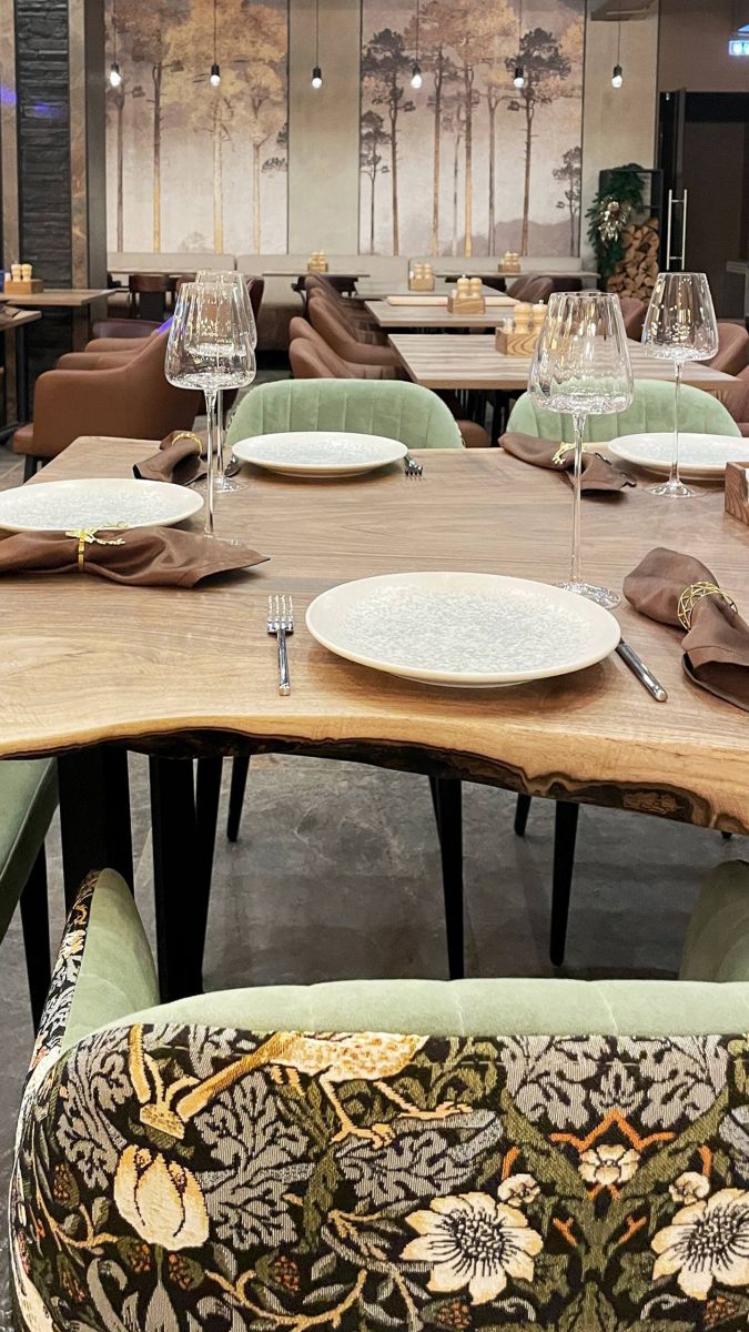 Друзья, недавно мы побывали в загородном комплексе «Циолковский», который расположен в живописном уголке Самарской области. Там открылся новый ресторан «Вкус Огня», и мы очень рады, что наша экологичная продукция стала частью его интерьера. В ресторане использованы бесшовные обои ECO с изображением деревьев (Арт. 35878) - они прекрасно перекликаются с окружающей природой: свежим воздухом, сосновым лесом и ароматом хвои, что позволяет гостям полностью погрузиться в атмосферу загородного отдыха.